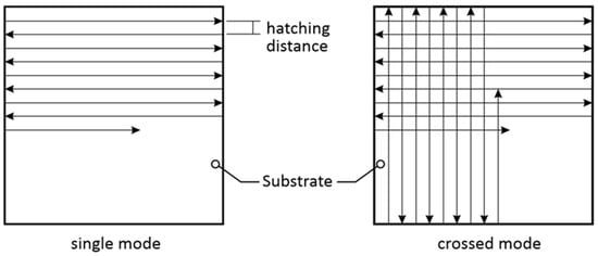 The single-line patterns and 40 × 40 mm two-dimensional (2D) square patterns were produced using the LIBT process. Figure 3 illustrates the schematic diagram of the hatching patterns. In this study, the laser fluence varied from 6.1 J/cm2 to 39.6 J/cm2, and the scanning speed was changed from 600 to 1400 mm/s. For 2D patterning, the hatch distance of the laser scanning path was varied from 50 to 100 µm, and the hatching pattern applied was single and crossed, as shown in Figure 3.