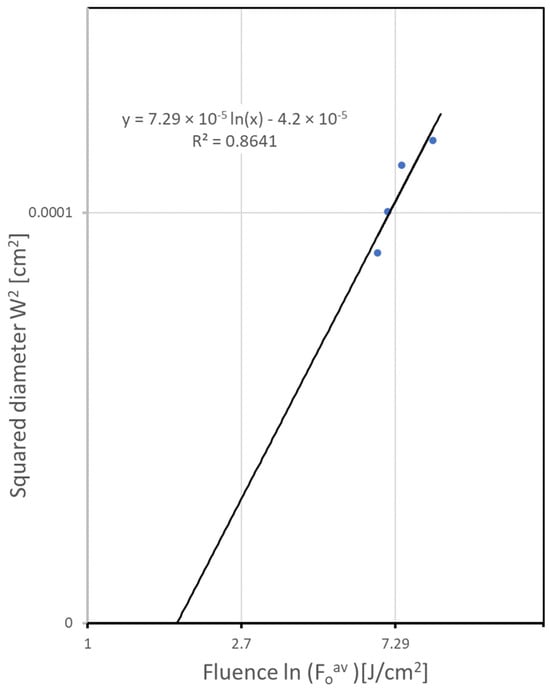 The ablation threshold measurements of zinc plate with 100 ns laser pulses of 1060 nm radiation. The squared diameter W2 of the ablated area is plotted as a function of the laser fluence . The slope of the linear fit (Equation (3)) yields the beam radius at the surface, w0, and the extrapolation to zero provides the ablation threshold Fth. R2 is a coefficient of determination for the linear fit.