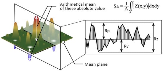Arithmetic mean height—Ra, Sa and maximum height—Rz, Sz graphical representation. Source: https://www.keyence.com. Accessed on 28 October 2023.