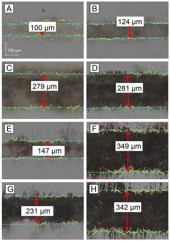 Optical images of transferred lines for different fluences and overlap degree: (A)—9.14 J/cm2, pulse overlap degree 75%; (B)—10.8 J/cm2, pulse overlap degree 71%; (C)—15.23 J/cm2, 75%; (D)—18 J/cm2, 71%, (E)—23.7 J/cm2, 36%; (F)—22.01 J/cm2, 64%; (G)—31.7 J/cm2, 36%; (H)—28.3 J/cm2, 54%.