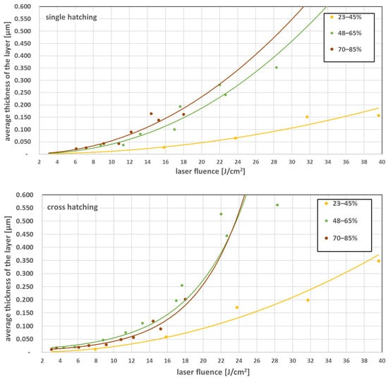 Average zinc layer thickness was measured for different laser fluences and grouped in three pulse-to-pulse overlap degree Δx ranges low: 23–45%, medium: 48–65% and high: 70–85%. Hatching line-to-line distance in y direction was 100 µm resulting in Δy = −61%. Results are summarized in Figure 8.