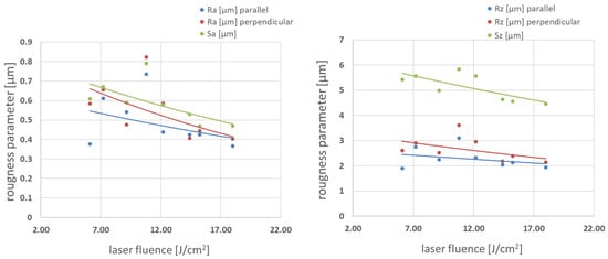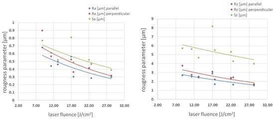 Roughness parameters vs. laser fluence in Δx 71–75% pulse-to-pulse overlap degree range.
