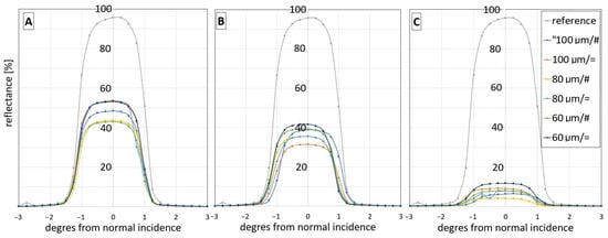 Reflectance for different overlapping line-to-line distance y: 100 µm, 80 µm, 60 µm. “=” stands for single hatching, “#”—stands for cross hatching of: (A)—glass/Zn interface at laser fluence of 18 J/cm2, pulse overlap degree Δx 71%, (B)—glass/Zn interface at laser fluence of 10.8 J/cm2 pulse overlap degree Δx 71%, (C)—air/Zn interface at laser fluence of 10.8 J/cm2 pulse overlap degree Δx 71%.
