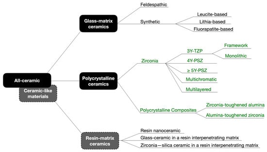 Schematic diagram of the updated classification of dental ceramics and ceramic-like materials, adapted from Gracis et al. (2015) [14] (the updated sections are presented in dark green). As glass-infiltrated ceramics produced by slip-casting and pure alumina ceramics have been withdrawn from the market, these groups were not considered in this update. Ceramic-like materials, such as resin-matrix ceramics represented by resin composite blocks for CAD/CAM, currently have more compositions than those presented in this paper. Due to the prolific launching in the market of new such products, including 3D-printed materials, they are not explored in this review. Modified with permission from CopyRightClearanceCenter.