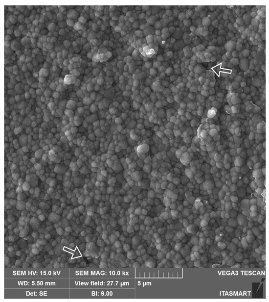 Scanning electron microscope (SEM) image of the 3Y-TZP framework. A dense microstructure is depicted with regular and homogeneous spherical zirconia grains and few microstructural defects (white arrows), which may be related to ceramic processing.
