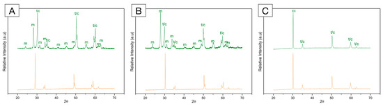 X-ray diffraction (XRD) pattern of (A) framework 3Y-TZP; (B) monolithic 3Y-TZP; and (C) 5Y-PSZ before (orange, bottom) and after (green, top) artificial aging in a hydrothermal reactor for 20 h at 134 °C under 2.2 bars of pression. A significant increase in monoclinic peaks (m) is depicted for both 3Y-TZPs, with higher peaks recorded for the monolithic, second-generation 3Y-TZP. Otherwise, 5Y-PSZ presents characteristic tetragonal (t) and cubic (c) peaks and no significant alterations after aging.