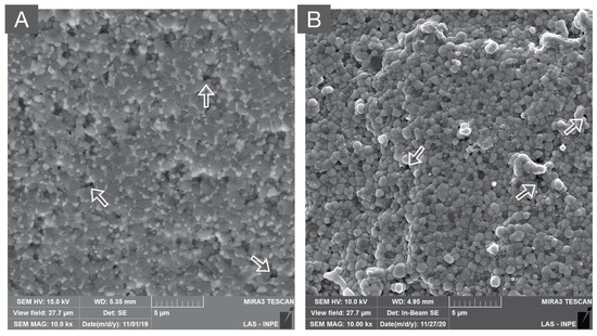 SEM micrograph of: (A) zirconia-toughened alumina (80% alumina and 20% zirconia) and (B) alumina-toughened zirconia (80% zirconia and 20% alumina) composites. Both polycrystalline composites present a dense microstructure with secondary phases that are homogeneously distributed in the alumina and zirconia matrices, respectively. Moreover, the white arrows indicate microstructural defects originating from ceramic processing.