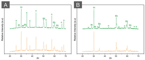 XRD patterns of (A) ZTA (70/30) and (B) ATZ (80/20) before (green, top) and after (orange, bottom) autoclave aging for 20 h at 134 °C under 2.2 bars of pression. While the high hydrothermal stability of ZTA is observed with almost no modifications in the diffractogram after aging, a limited amount of phase transformation is depicted in ATZ after aging. Letters represent (m) monoclinic peaks, (t) tetragonal peaks, (c) cubic peaks, and (α) alpha alumina peaks.