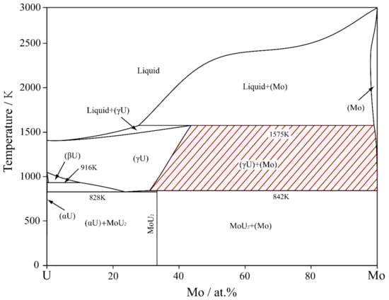- Okamoto, H. Mo-U (Molybdenum-Uranium). J. Phase Equilibria Diffus. 2012, 33, 497. [Google Scholar] [CrossRef]