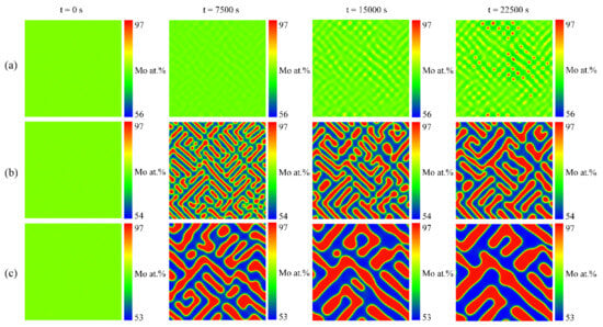 Simulation results of the spinodal decomposition in U-75 at.% Mo alloy at 1273 K under different irradiation intensities. Rows (a–c) correspond to dose rates of 5.0 × 10−5 dap/s, 1.0 × 10−4 dap/s and 2.0 × 10−4 dap/s, respectively.