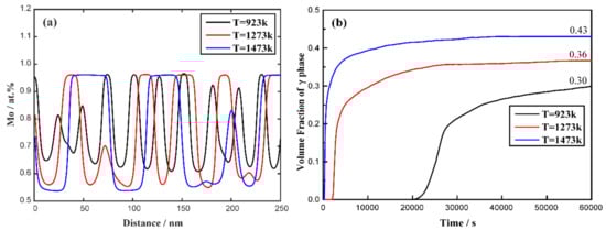 The microstructure evolutions of the U-75 at.% Mo alloy at 923, 1273 and 1473 K are shown in Figure 3, which reflects the effects of different temperatures on spinodal decomposition. It can be seen that the morphology evolution rate of the M-enriched γ-phase accelerates with the increase in temperature. The size of the Mo-enriched γ-phase increases while the number of particles decreases, and the morphology of the Mo-enriched γ-phase becomes plane-like. Figure 4a shows the concentration profiles of the Mo-enriched γ-phase in the U-75 at.% Mo alloy under different temperatures at the time of 22,500 s. Upon temperature elevation, the fluctuation range of the composition gradually increases, and the Mo-enriched γ-phase reaches an equilibrium composition earlier. Figure 4b depicts the volume fraction evolution of the Mo-enriched γ-phase in the U-75 at.% Mo alloy at different temperatures. It is evident that the volume fraction of the Mo-enriched γ-phase increases significantly at high temperatures. Specifically, at 60,000 s, the equilibrium volume fractions of the Mo-enriched γ-phase are 30%, 36% and 43% for temperatures of 923 K, 1273 K and 1473 K, respectively.