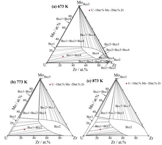 The calculated isothermal sections of U-Mo-Zr alloy: (a) 673 K, (b) 773 K, (c) 873 K.
