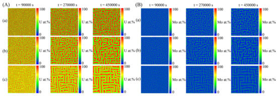 Simulation results of the spinodal decomposition in U-10 at.% Mo-20 at.% Zr alloy at different temperatures. (A) U-enriched γ-phase, (B) Mo-enriched γ-phase. Rows (a–c) correspond to the temperatures of 673 K, 773 K and 873 K, respectively.