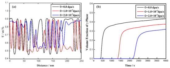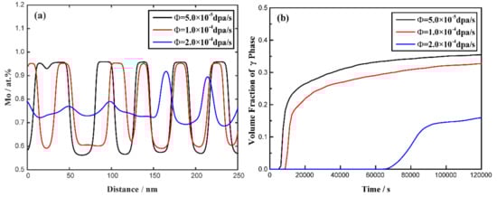 (a) The calculated concentration profiles at the time of 3300 s and (b) volume fraction as a function of time for the U-10 at.% Mo-20 at.% Zr alloy at 873 K under different dose rates.