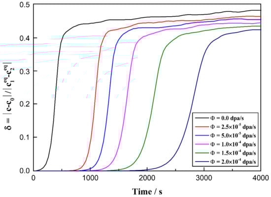 where is the maximum instantaneous concentration at t, c0 is the initial concentration and and indicate the equilibrium concentrations of the Mo-rich and Mo-lean phases. Figure 12 shows the change in the δ value versus time for the U-10 at.% Mo-20 at.% Zr alloy under various irradiation conditions at 873 K. According to Figure 12, one can easily find that the process of spinodal decomposition is retarded with the increase in irradiation intensity.