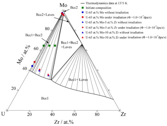 Recently, because of their good irradiation stability, high-density fissionability, high thermal conductivity and low manufacturing cost [2,13], U-Mo and U-Mo-Zr alloys are considered as promising candidate fuels for fast breeder reactors. Various efforts have been made to study their mechanical properties [14,15], phase stability [4,16,17] and phase transformation [18,19]. The addition of Mo can effectively stabilize the γU-phase and improve the thermal conductivity and anti-swelling property [20], and the addition of Zr can effectively improve the stability of γU-phases over a wider temperature range [14]. It is reported that, with the microstructure of spinodal decomposition, the accumulation of fission gases and the swelling effect could be well detained in U-Mo alloys [21]. In addition, the results of Yao et al.’s research [7,8] showed that the spinodal decomposition formed nanoscale structures in U-Zr alloys after irradiation, and that this kind of microstructure could effectively prevent the irradiation swelling of fuel slugs. Our previous results [22] indicated that the effect of irradiation on microstructure evolution is opposite to that of spinodal decomposition; i.e., the solute atoms can be driven back into the solution phase during spinodal decomposition. However, the spinodal decomposition and de-mixing effect of U-Mo and U-Mo-Zr alloys under irradiation are still not clear.