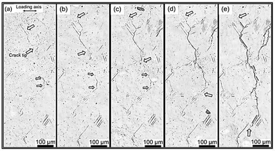 Microscopic characterization of the CrMnFeCoNi alloy with different load cycles under 270 MPa, (a) 4 × 105 cycles, (b) 7.5 × 105 cycles, (c) 9.5 × 105 cycles, (d) 1.0 × 106 cycles, (e) 1.05 × 106 cycles, the white arrow represents the crack tip [22].