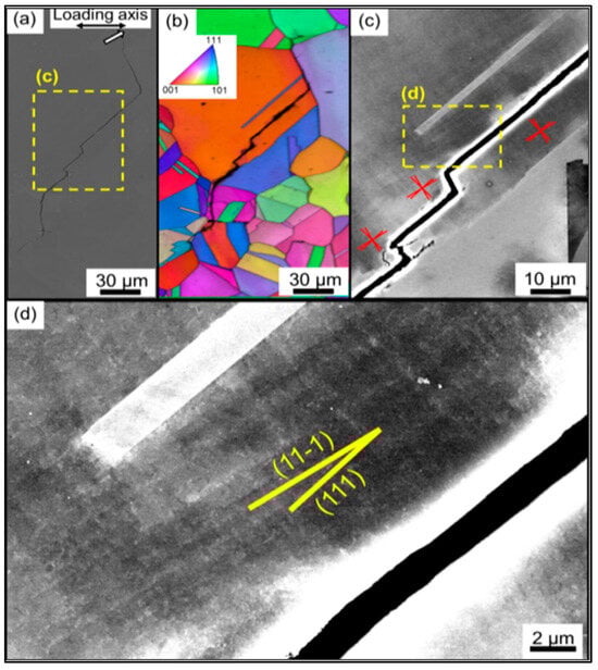 The crack initiation in the CrMnFeCoNi alloy was observed on the {111} slip plane and {11-1} slip plane, as depicted in Figure 2d. Once slip deformation occurs, the accumulation of dislocations on a single slip plane leads to the development of slip surfaces and subsequently triggers the initiation of fatigue cracks [23]. In high-entropy alloys, multiple slip planes exist. Activation of the {111} slip plane indicates the initiation of grain boundary sliding within the lattice [24]. However, during the sliding process, the grain boundary may encounter certain obstacles. If the obstruction at the grain boundary is significant, the slip plane may be forced to shift to a different direction, specifically activating the {11-1} slip plane. Therefore, crack initiation in CrMnFeCoNi alloys is a consequence of the combined action of {111} and {11-1} slip planes.