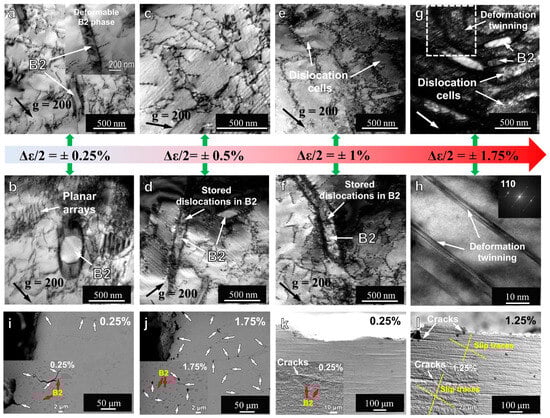 It can be found that slip is the dominant mechanism of the micro deformation mechanism from low strain amplitude (Figure 3a–h) below 1%, and few micro-cracks initiate at low strain amplitude (0.25%). When the strain amplitude increases to 1%, due to the active cross slip in the FCC matrix, dislocation cells are formed, but no deformation twins are found. When the strain amplitude was further increased to 1.75%, the elongated dislocation cells separated by denser and severely tangled dislocations and the deformation twins generated in the more severely tangled region (Figure 3g,h) were observed. The results show that these microcracks mainly initiate and propagate near the larger B2 precipitates. This is due to the long incoherent interface of the precipitates, which cannot effectively adjust the stress concentration [27,28,29,30]. With cyclic loading, plastic deformation initially appears in the soft FCC matrix, leading to the multiplication and recombination of dislocation substructures within the matrix. Meanwhile, hard B2 precipitates act as hindrances and resistance to plastic deformation. With the further movement of hindered dislocations, the development of internal interphase stress promotes cyclic strain hardening. The plastic deformation gradually extends to the hard B2 phase as the cyclic number and strain increase, resulting in a large number of dislocations in the B2 phase and severe plastic deformation of the B2 phase at low strain amplitude. Moreover, under all the strain amplitudes, due to the strain incompatibility between FCC matrix and B2 phase, dense dislocations were accumulated around the B2 precipitates. Therefore, due to the difference in hardness and mechanical properties between the hard B2 phase and the soft FCC phase, inhomogeneous deformation occurs during cyclic loading [31]. This inhomogeneous deformation creates local stress concentrations at the interface between the two phases, which can result in the initiation of microcracks [32].