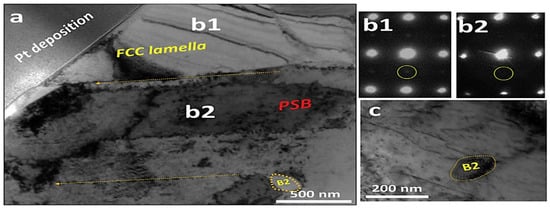 (a) Results of microstructure formed under AH + LTA under BFTEM, (b1) SADPs obtained in FCC lamellar, (b2) SADPs obtained in PSB, (c) dislocation accumulation near B2 under high-power TEM scanning, SADPs are abbreviations of selected area diffraction patterns [34].