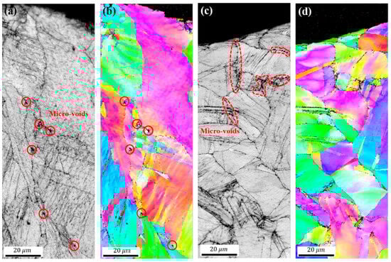 In Figure 6, we can observe that the RT sample forms micro-voids at grain boundary triple junctions, while the CT sample forms micro-voids at grain boundaries and twin boundaries. In Figure 7, it is observed that the distance between the micro-voids in the CT sample is closer than that in the RT sample. Under the action of cyclic stress, the crack at the fatigue crack initiation site repeatedly expands and closes, forming fatigue striations. During this process, if there are voids inside the material, they act as notches, facilitating crack nucleation and allowing adjacent voids to easily connect and grow into cracks [47,48,49]. Furthermore, the size and spacing of micro-voids also play a significant role in crack initiation. Since all closely spaced micro-voids are involved in the nucleation and growth process of cracks, larger micro-void size and shorter micro-void spacing result in faster fatigue crack initiation. Therefore, CT specimens are more prone to fatigue failure than RT specimens. Consequently, analyzing the micro-morphology as a contributing factor to the initiation of material cracks is an important consideration.