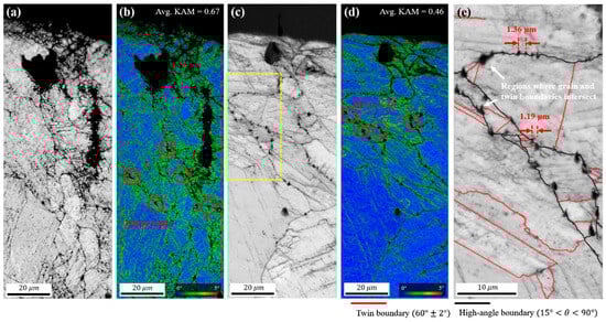 (a,b) are the EBSD scanning results of RT specimen at the fatigue crack initiation site, respectively. (a) is EBSD IQ, (b) is KAM, (c,d) are the EBSD scanning results of CT specimen at the fatigue crack initiation site, respectively. (c) is EBSD IQ, (d) is KAM, and (e) is the area in the yellow dotted line box of (c) [43].