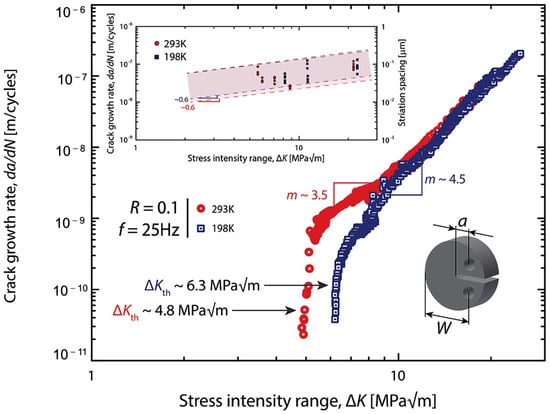 Fatigue-crack growth behavior of the CrMnFeCoNi alloy in different temperatures, the horizontal coordinate is the stress intensity range and the vertical coordinate is the fatigue crack expansion rate, samples tested on disc-shaped compact-tension (DC(T)) at a frequency of f = 25 Hz. The smaller, solid symbols in the inset represent the relationship between the variation of local crack-growth rates, estimated from striation spacing measurements on scanning electron microscopy images of the fracture surfaces, and ΔK [52].