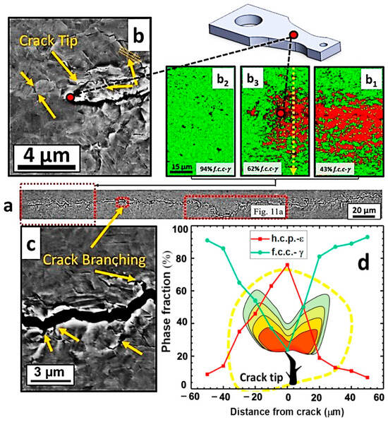Figure 11a,b depict the occurrence of a local transformation from the γ phase to the ε phase within the plastic deformation region near the fatigue crack tip. This transformation triggers the formation of microcracks on the primary crack and delays crack initiation. These microcracks disperse the energy associated with the propagation of the primary crack, leading to an increased propagation path. Consequently, fatigue failure is delayed. To sustain the local work hardening activity even under cyclic loading conditions, strain facilitates the dynamic load transfer between the γ and ε phases. Furthermore, significant cyclic plastic deformation occurs during crack propagation, resulting in additional energy dissipation [65].