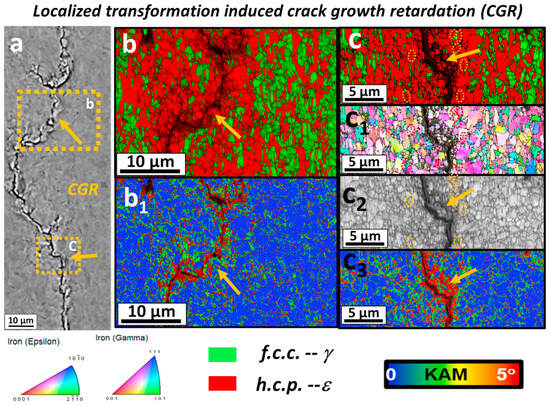 Microscopic characterization of crack growth retardation induced by local deformation. (a) is the BSE image of the crack area. (b) is the EBSD phase diagram after amplification of region b in (a), (b1) is the KAM analysis of (b), (c,c1–c3) is the EBSD phase diagram, IPF diagram, image quality map, and KAM analysis diagram of region c, respectively [62].