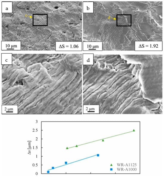 Figure 12 compares the fatigue crack growth behavior at the strain amplitude ( = 0.85%) of a fine-grained sample (WR-A1000, d~10 μm, A = annealed, WR = warm-rolled) heat-treated at 1000 °C, to a coarse-grained sample (WR-A1125, d~66 μm), heat-treated at 1125 °C. It can be observed that reducing the grain size (d) from 66 to 10 leads to a decrease in the average striation pacing (Δs) from 1.92 to 1.06 when observing the fracture surface at a distance of 500 from the crack initiation point (L). This observation suggests that a decrease in grain size effectively retards the growth rate of fatigue cracks. The fine-grain specimen exhibits superior strength and enhanced elastic resistance in comparison to the coarse-grain specimen. This implies that controlling the microstructure can yield positive effects on the initiation and propagation of fatigue cracks. Several studies have provided evidence that reducing the grain size can enhance deformation homogeneity, suppress slip cracking, and decrease the accumulation of slip bands, consequently delaying the initiation and propagation of fatigue cracks [7,9,67].