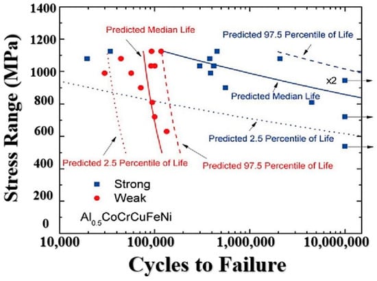 Hemphill et al. studied AlCoCrCuFeNi and used the Weibull predictive model to quantify its fatigue behavior [69]. This model is based on the commonly used analytical expression of the S-N curve given by Equation (1). The assumption is made that a Weibull distribution can describe the fatigue life distribution within each fixed stress range.