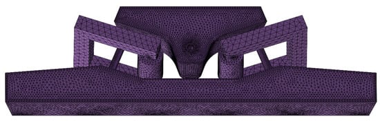 Tetrahedral mesh was used to divide the tundish’s three-dimensional geometric mesh because it can adapt well to various shapes. To enhance the calculation results for the channel, it was separated into regular cylinders and irregular sections of the bifurcation by using the extension surface of the discharging chamber wall as a cross-section. The regular cylindrical part was swept with a triangular mesh, and the irregular part was divided into a tetrahedral mesh. At the same time, the boundary layer meshing of the tundish wall was performed. On the basis of the finer grid division of the core and coil, the focus here was on grid-independent research on molten steel. The number of tundish meshes was divided into 800,000; 1,200,000; 1,600,000; and 2,000,000. According to the computation findings, the average steel flow rate in the tundish is 0.021 m/s when there are 1,600,000 elements, and the average flow rate of molten steel in the tundish stays constant if the mesh is improved further. As a result, the ideal grid number for the tundish in this study should be around 1,600,000. This results in a total of 1,595,860 elements for meshing the molten steel in the induction-heating tundish. Figure 2 depicts a schematic representation of the geometric meshing.