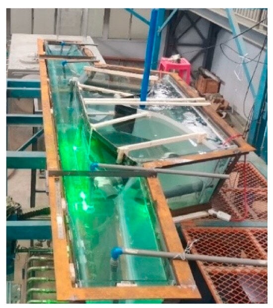 According to experience and the literature, the temperature rise range of the molten steel in the induction-heating tundish channel is 8–13 K. According to Formula (13), the corresponding temperature rise range of the channel in the water model is 2.5–4.1 K. To simulate the effect of channel induction heating, 3 kW heating rods were used in the water model to heat the water in the channel. There was a 2–4 °C difference that formed between the inlet and outlet of the water model channel. And the result satisfies the Zb criterion, which is the ratio of buoyancy force () to inertia force (). Figure 3 provides an on-site picture of the water model.