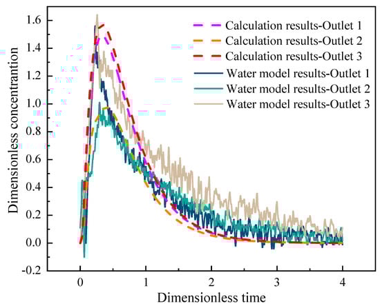 Since the tundish has a symmetrical structure, the residence time distribution (RTD) curve only analyzes the stimulus response curves of outlets 1–3. Figure 4 depicts the on-site RTD curve as well as the computed RTD curve.