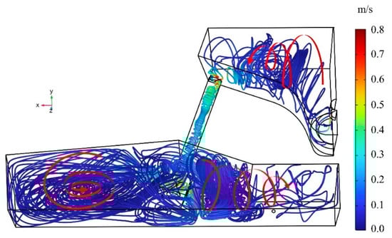 In the tundish, the melted steel is affected by the Lorentz force since it is comparable to a closed loop conductor under electromagnetic-induction-heating conditions. Due to the Lorentz force induced by the strong axial current, the molten steel will generate a pinch effect [28] in the direction of the radii. The tundish exhibits a revolving flow of molten steel, with the spinning action being more noticeable in the channel area. Figure 5 displays the streamline placement of molten steel due to the symmetry of the tundish. The red curve in the figure indicates the flow trend of molten steel, and the arrow indicates the flow direction.