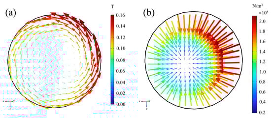 The Lorentz force in the B-B section is directed toward the lower left of the center, and the Lorentz force near the coil surface in the upper right is the largest, amounting to 2.11 × 105 N/m3. The Lorentz force progressively diminishes from the channel surface to the axis, causing a radial rotating flow to form.