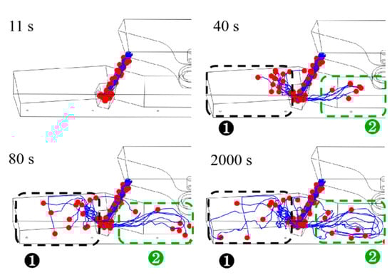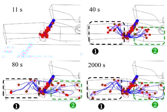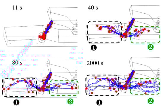 As determined through studies and practical usage, the receiving chamber eliminates the majority of the inclusions in the double-channel induction-heating tundish. Nonetheless, inclusion particles are still present in the channel and the discharging chamber, significantly affecting the bloom’s quality. Only the movement trajectory of the inclusion particles in the channel and discharging chamber was studied in order to analyze the distribution of inclusion particles in the channel and discharging chamber in detail. Figure 9, Figure 10 and Figure 11 show the computed motion trajectories and dispersion of inclusion particles, respectively, at 11 s, 40 s, 80 s, and 2000 s after the inclusion particles were released at temperatures of 1750 K, 1800 K, and 1850 K. In Figure 9, Figure 10 and Figure 11, the red balls represent inclusion particles, and the blue curves represent the movement trajectories of inclusion particles.