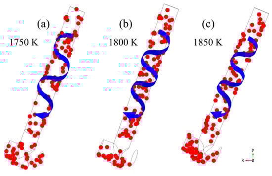 Further analysis revealed that under different molten steel temperature conditions, the inclusions in the channel will form a spiral distribution trend due to the Lorentz force, as seen in Figure 12, in which the blue curve indicates the trend line of the rotational distribution of inclusion particles, and the red dots represent inclusion particles. Since inclusion particles are insulators, they travel toward the channel surface and partially cling to the inner wall when the pinch effect occurs in the channel. This creates a distribution that matches the molten steel’s flow trend.