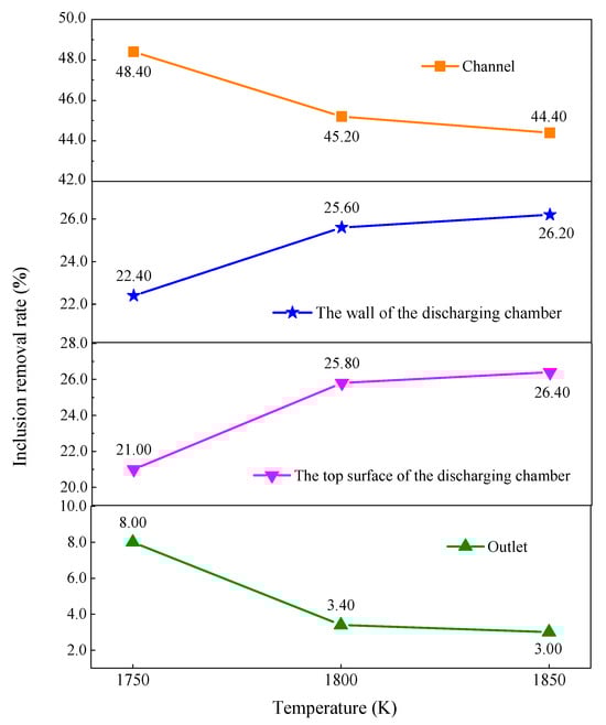 - When the molten steel temperature increased from 1750 K to 1850 K, the removal percentage of inclusion particles on the discharging chamber wall and top layer increased by 9.20%, the removal percentage of inclusion particles on the outlet decreased from 8.00% to 3.00%, and the removal percentage on the channel surface decreased from 48.40% to 44.40%.