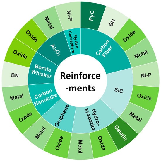 Many Mg devices are often coated with alloy or composite coatings to improve wear and corrosion resistance [32,33,34]. Similarly, the surface coating treatment of reinforcements is considered to be one of the effective methods to protect reinforcements and modify the interface. Generally, coating treatments include chemical vapor deposition (CVD) [35], electroless plating [36], sol–gel [22], etc. The presence of coatings can improve the dispersion and the interfacial wettability with the Mg matrix. Furthermore, the processing of MMCs frequently necessitates the application of elevated temperatures and pressures. In this regard, the implementation of coatings serves to protect the reinforcements against potential harm throughout the processing procedure. A variety of materials are used for coating, including metals, oxides, ceramics, etc. By summarizing the current research, the main reinforcements and corresponding coating materials used in MMCs are shown in Figure 1.