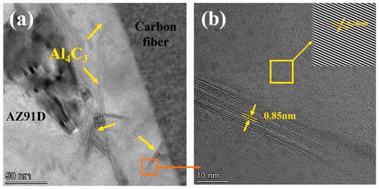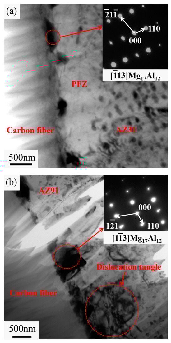 TEM images of the composites. (a) PyC-CF/AZ31 composite; (b) PyC-CF/AZ91 composite. Reproduced from [35] with permission of the publisher (Elsevier).