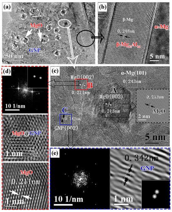 (a) TEM image of the composite, HRTEM image of (b) β-Mg17Al12 phase, and (c) MgO nanoparticle. SAED and IFFT images of (d) region B and (e) region C. Reproduced from [96] with permission of the publisher (Elsevier).