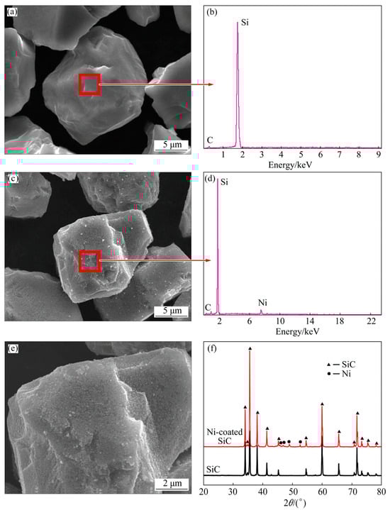 SEM micrographs of uncoated (a) and Ni-coated (c,e) SiCp and corresponding EDS results (b,d). XRD patterns of Ni-coated and uncoated SiCp (f). Reproduced from [111] with permission of the publisher (Elsevier).