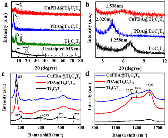 (a) XRD patterns for unstripped Ti3AlC2 and exfoliated Ti3C2Tx, PDA@Ti3C2Tx, and CuPDA@Ti3C2Tx. (b) Enlarged XRD patterns in small angles for the calculation of the interlayer distance in corresponding materials. (c,d) Raman spectra of exfoliated Ti3C2Tx, PDA@Ti3C2Tx, and CuPDA@Ti3C2Tx in different wavenumber regions.