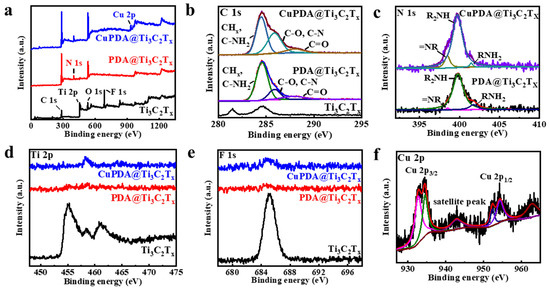 (a) Full XPS spectra for Ti3C2Tx (black curve), PDA@Ti3C2Tx (red curve), and CuPDA@Ti3C2Tx (blue curve), and fine deconvoluted XPS spectra for (b) C 1s, (c) N 1s, (d) Ti 2p, (e) F 1s, and (f) Cu 2p.