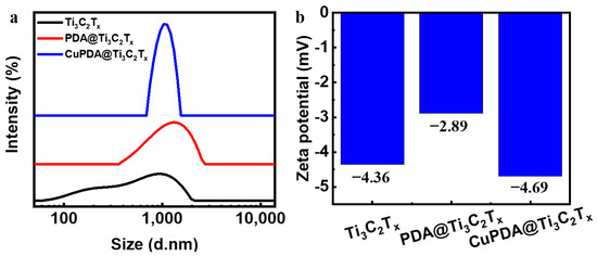 (a) Particle size distribution diagram and (b) zeta−potential diagram for Ti3C2Tx, PDA@Ti3C2Tx, and CuPDA@Ti3C2Tx.