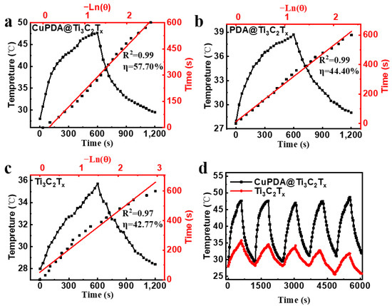 Photothermal conversion efficiencies of (a) CuPDA@Ti3C2Tx, (b) PDA@Ti3C2Tx, and (c) Ti3C2Tx, red line is the linear fitting curve. (d) Stability curves of photothermal heating–cooling for CuPDA@Ti3C2Tx (black curve) and Ti3C2Tx (red curve).