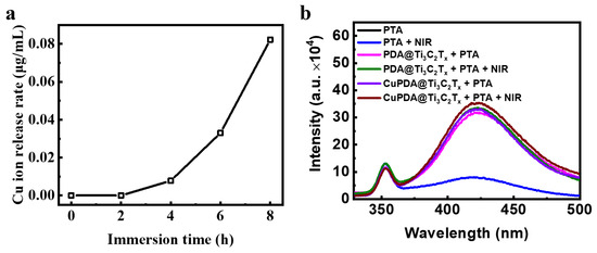 (a) Cu ion release curve for CAG@CuPDA@Ti3C2Tx. (b) Fluorescence spectra in the presence of PTA with and without NIR irradiation.