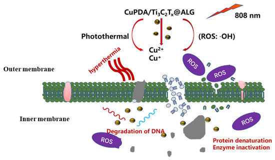 In brief, the combination of copper ion chemical antibacterial and PTT antibacterial therapies can effectively produce antibacterial effects through NIR irradiation [52]. As shown in Figure 11, when exposed to 808 nm NIR irradiation, CAG@CuPDA@Ti3C2Tx can convert light energy into heat energy, resulting in a thermal effect that alters the structure of bacterial cell membranes. This alteration leads to changes in bacterial cell membrane permeability, and in extreme cases, high heat levels can directly cause a bacterial membrane rupture [53,54]. At the same time, a certain number of H2O2 molecules are produced due to the spontaneous self−oxidation of PDA in the presence of O2. Then, the Cu+ Fenton−like reaction, as described above, is used to catalyze H2O2 into more oxidative form of •OH. Due to the increase in the outer−membrane permeability caused by photothermal treatment, Cu2+ and Cu+ ions, as well as •OH, enter the interior of the cells, damaging the proteins, DNA, and other structures. Therefore, this damage affects the normal physiological activities of bacteria and leads to bacterial lysis and death.
