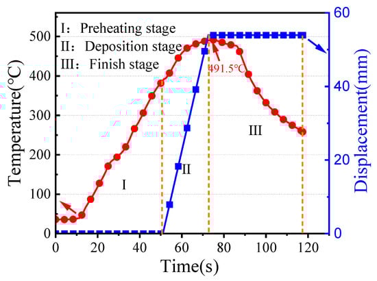 As shown in Figure 3, the temperature profile at the end face of the tool head with deposition time was recorded. The deposition process consists of three stages: the pre-heating stage, the deposition stage, and the finishing stage. The highest temperature recorded during the stable deposition stage is 491.5 °C, which is also the temperature experienced by the deposition layer.